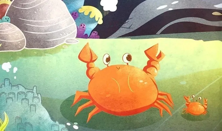 Trên một bãi biển ấm áp, có một con cua mẹ và cua con...
