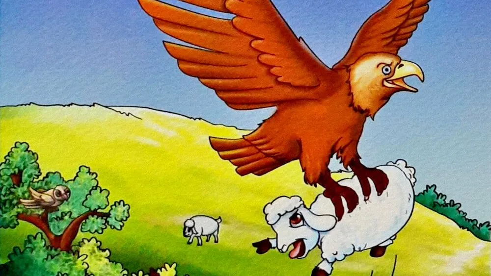 Bầy cừu tha thẩn ăn cỏ trên đồng. Một con đại bàng không hiểu từ đâu bay tới lao xuống quắp một chú cừu mang đi. Quạ nhìn thấy thế cũng đâm thèm chén thịt.