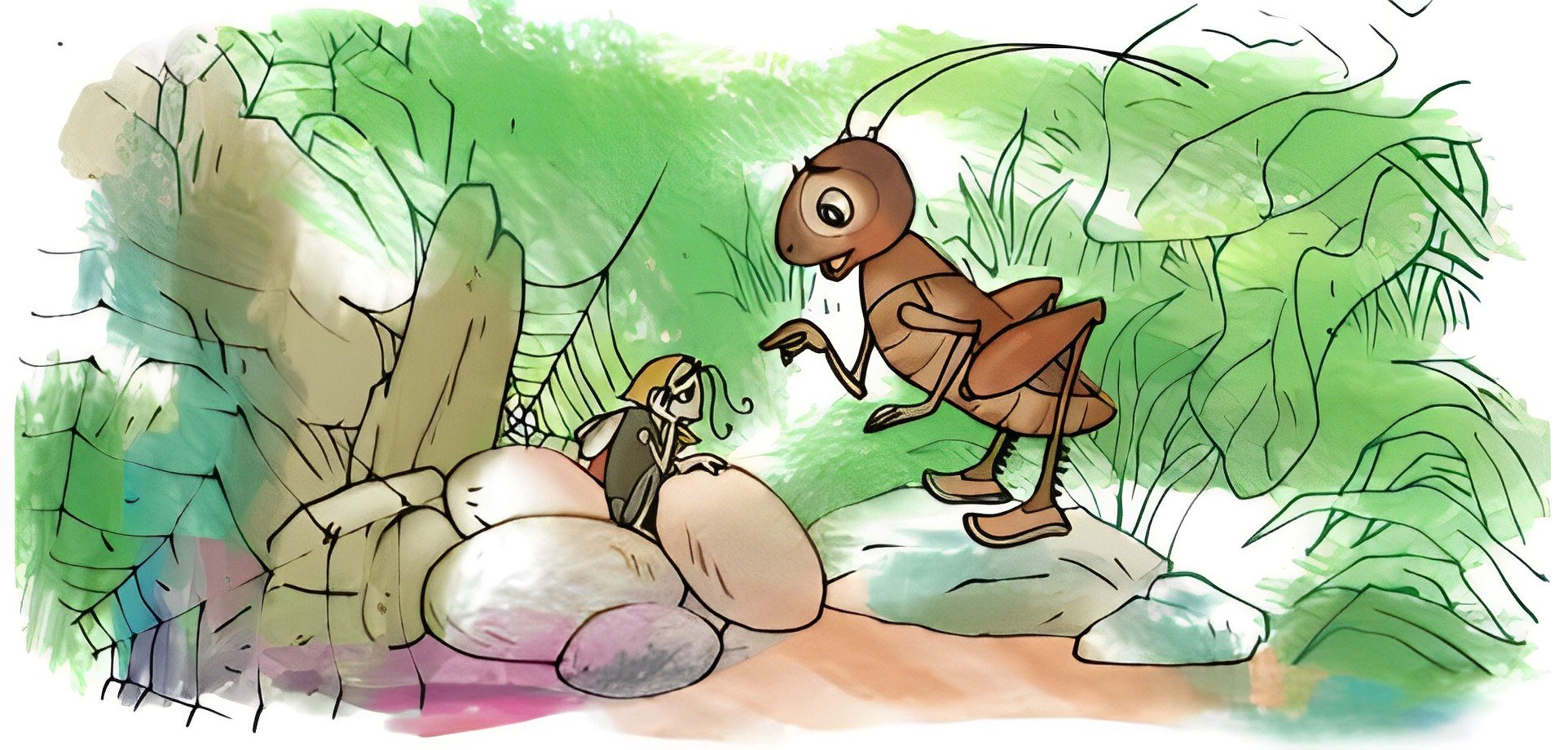 Một hôm, qua một vùng cỏ xước xanh dài. Tôi chợt nghe tiếng khóc tỉ tê. Đi được vài bước nữa, tôi gặp chị Nhà Trò ngồi gục đầu bên tảng đá cuội.