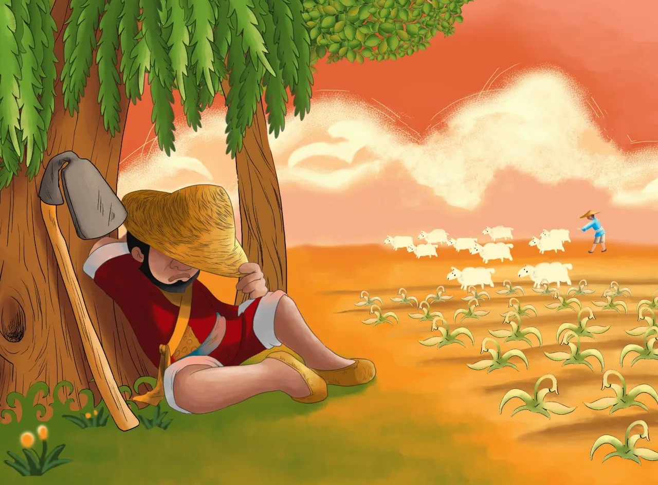 Một người nước Tống đang cày ruộng. Giữa ruộng có một cây to. Có con thỏ đồng từ đâu chạy lại đâm vào gốc cây, đập đầu chết.