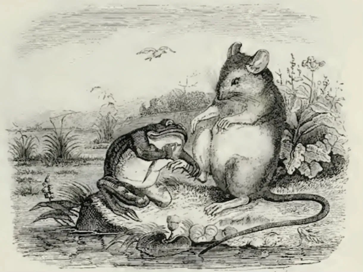 Một con chuột nhắt phiêu lưu chạy dọc theo bờ ao ở đó có một con ếch sinh sống. Khi Ếch nhìn thấy Chuột, nó bơi vào bờ và ộp ộp kêu: “Không vào chơi với tôi một chút à? Tôi có thể hứa chắc bạn sẽ rất vui khi vào đây đấy.”