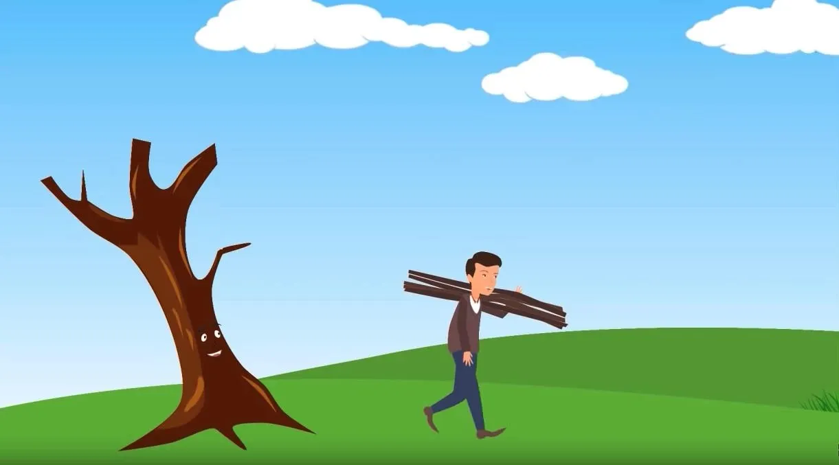 Một hôm, người tiều phu ra bờ sông chặt củi. Bỗng anh ta bị tuột tay, làm chiếc rìu rơi tõm xuống sông.